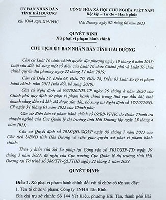 Mới đây, UBND tỉnh Hải Dương ban hành Quyết định số 1064/QĐ-XPVPHC ngày 02/6/2023 về việc xử phạt Công ty TNHH Tân Bình (TP.Hải Dương) tại địa chỉ 144 Yết Kiêu, phường Hải Tân, thành phố Hải Dương.