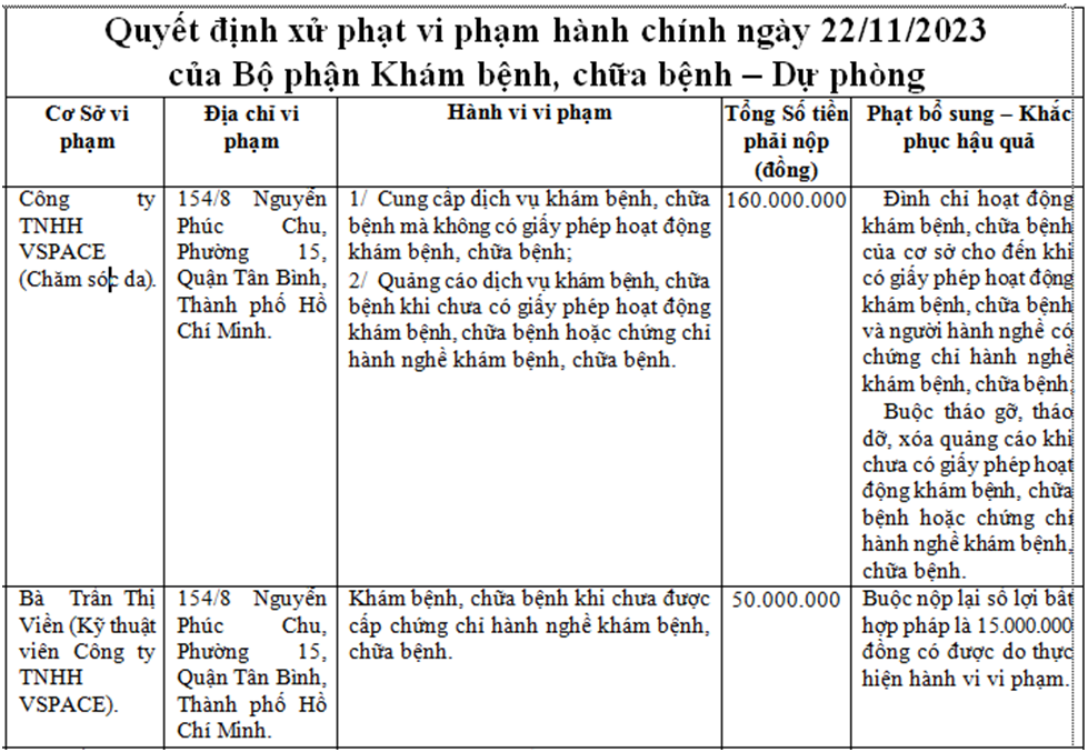Thông tin từ Thanh tra Sở Y tế TPHCM, đơn vị này vừa ra quyết định xử phạt và đình chỉ hoạt động đối với Cơ sở chăm sóc da thuộc Công ty TNHH VSPACE có địa chỉ tại 154/8 Nguyễn Phúc Chu, Phường 15, Quận Tân Bình.