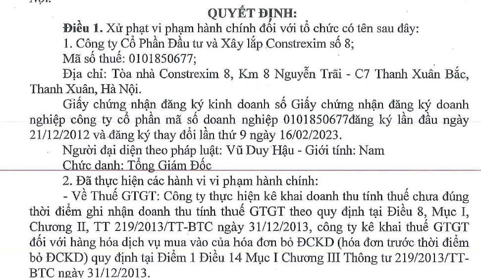 CTCP Đầu tư và Xây lắp Constrexim Số 8 đã thực hiện kê khai doanh thu tính thuế chưa đúng thời điểm ghi nhận doanh thu tính thuế GTGT. Về thuế TNDN, Công ty hạch toán chi phí quản lý doanh nghiệp đối với hành hóa dịch vụ mua vào của hóa đơn bỏ DDCKD (hóa đơn trước thời điểm bỏ ĐCKD).