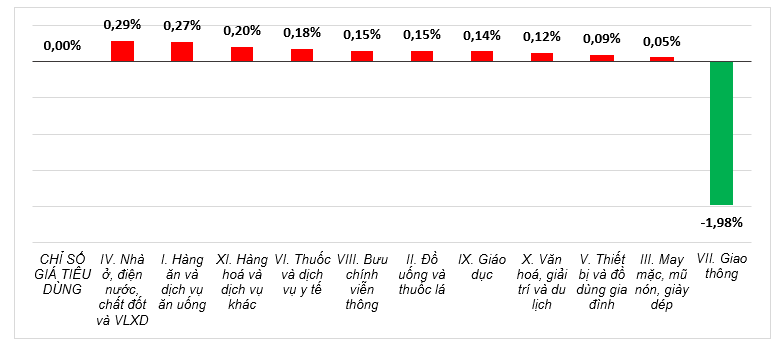 Riêng nhóm giao thông giảm 1,98% (tác động làm giảm CPI chung 0,19 điểm phần trăm), chủ yếu do: Giá dầu diezen giảm 7,05%; giá xăng trong nước giảm 5,83% do ảnh hưởng của các đợt điều chỉnh giá trong tháng; giá vận tải hành khách bằng đường sắt giảm 4,09%; xe ô tô đã qua sử dụng giảm 0,28%. Bên cạnh đó, các nhóm hàng tăng giá: Giá phụ tùng ô tô tăng 0,4%; giá dịch vụ bảo dưỡng phương tiện đi lại tăng 0,91%; phí học bằng lái xe tăng 1,7%.