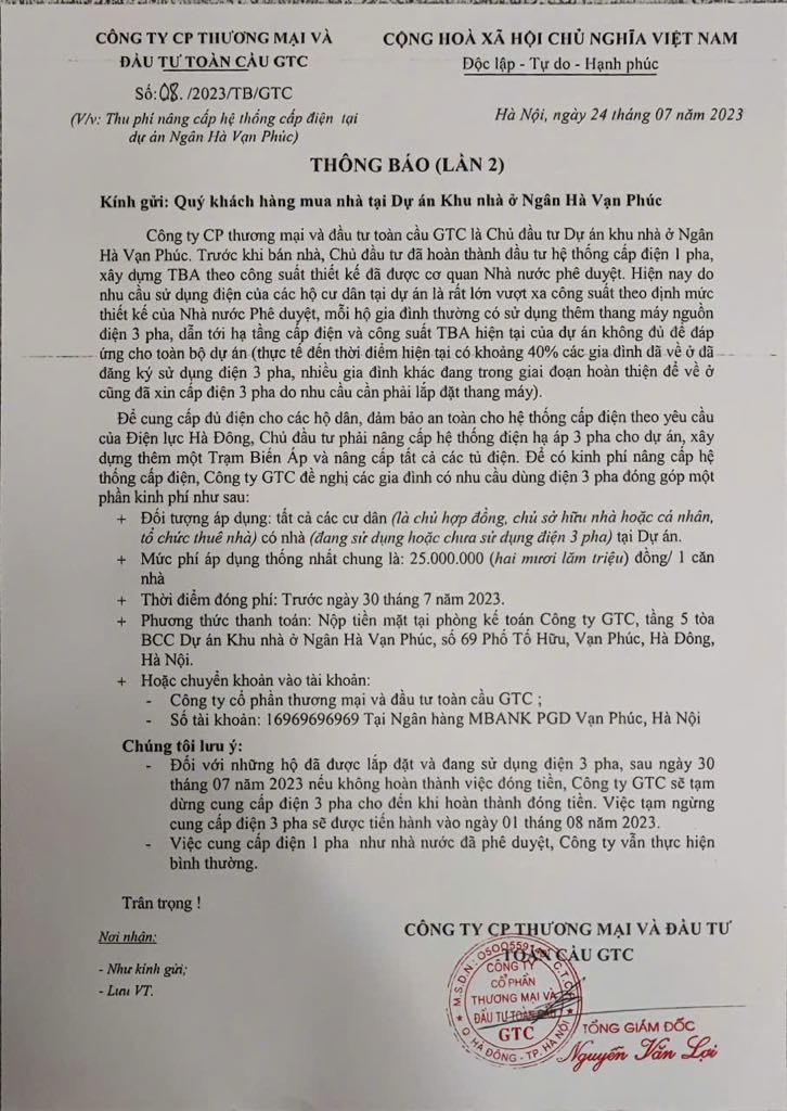 Thông báo của Công ty GTC tới cư dân về việc phải đóng 25 triệu đồng/căn hộ để nâng cấp hệ thống điện hạ áp 3 pha.