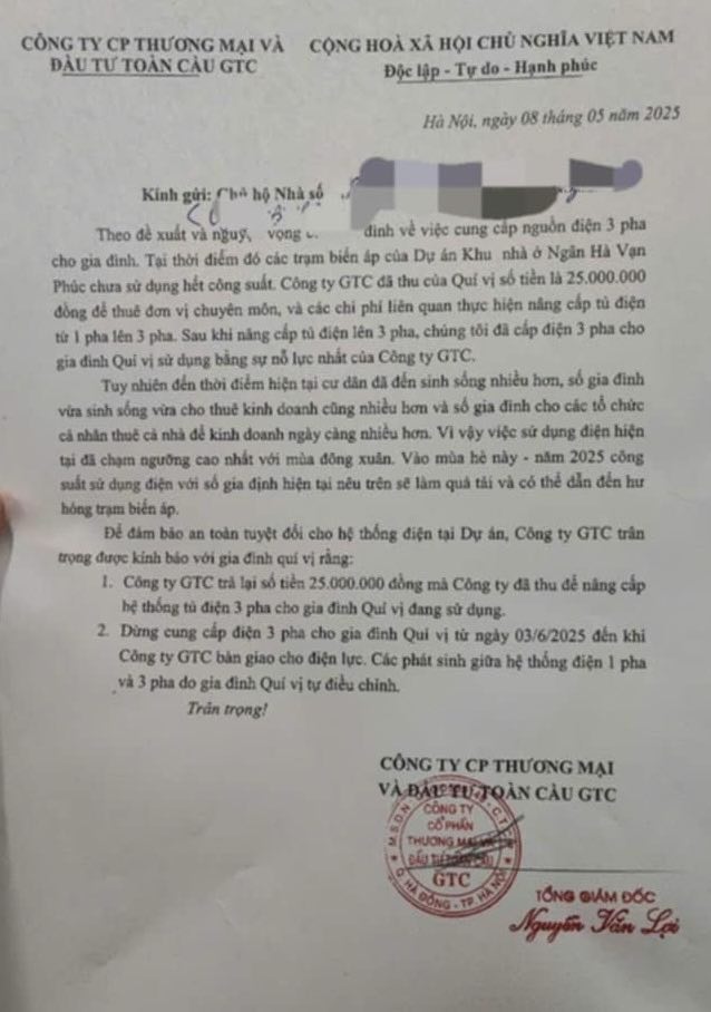 Tuy nhiên, đến tháng 7/2023, chủ đầu tư bất ngờ yêu cầu các hộ dân phải đóng thêm 25 triệu đồng với lý do “nâng cấp trạm biến áp” nếu muốn tiếp tục được sử dụng điện 3 pha. Điều đáng nói là khoản phí này được áp đặt một chiều, không có bất cứ hợp đồng bổ sung hay sự đồng thuận nào từ phía cư dân, khiến người dân cảm thấy bị ép buộc và thiếu minh bạch.