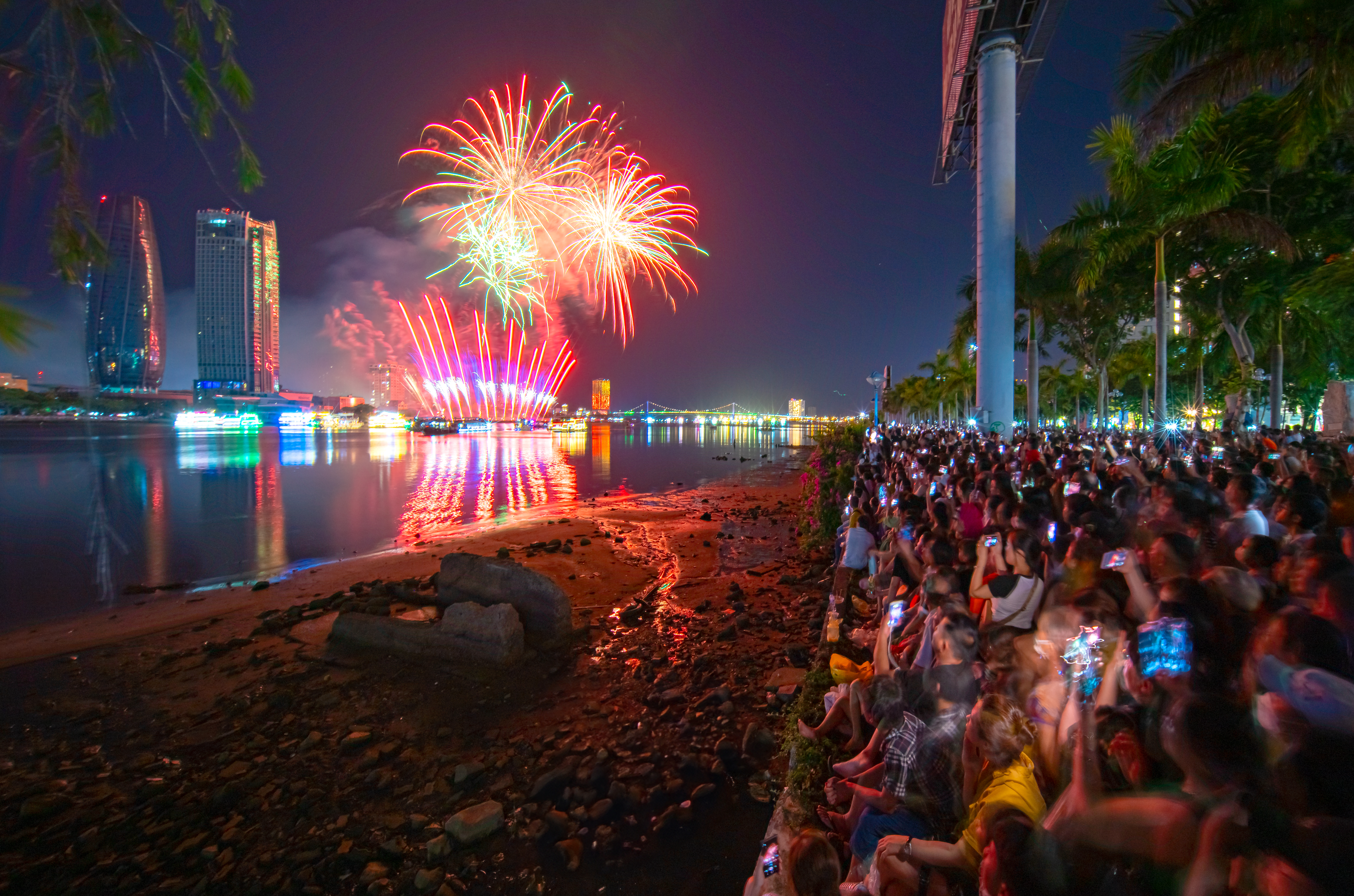 Du khách đứng ken kín hai bên bờ sông Hàn để xem trình diễn pháo hoa