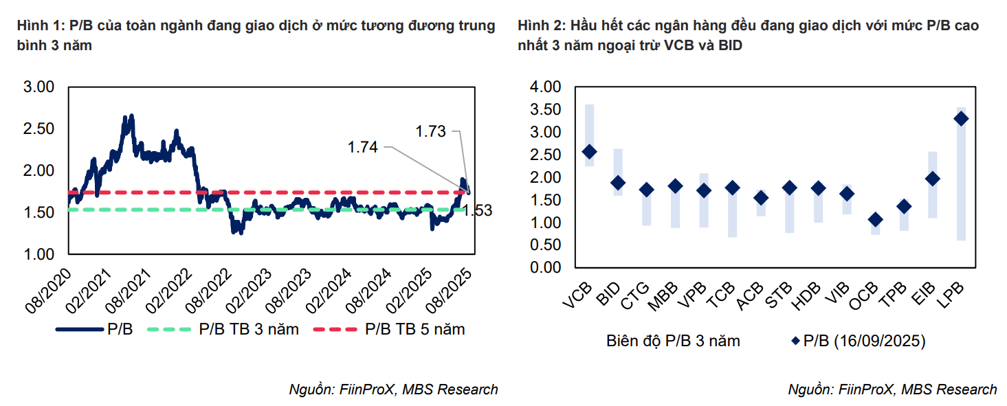 Nhìn tổng thể, bức tranh quý III/2025 cho thấy ngành ngân hàng đã thoát khỏi nhịp tăng trưởng chậm của nửa đầu năm, với tín dụng và lợi nhuận cùng bứt phá. Triển vọng cả năm 2025 được giữ ở mức tích cực, khi lợi nhuận toàn ngành dự báo tăng khoảng 15% so với cùng kỳ. Tuy vậy, mặt bằng định giá hiện không còn quá hấp dẫn, khi hệ số P/B của ngành đã cao hơn mức trung bình ba năm.