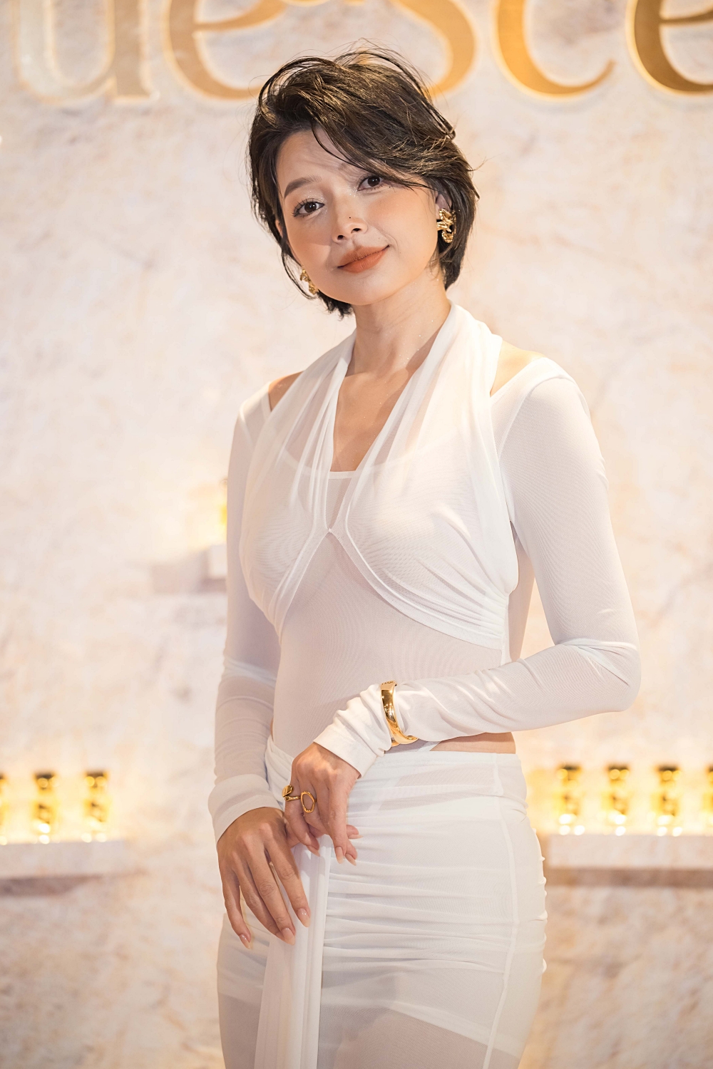 Lê Hạ Anh khoe nhan sắc rạng ngời trong thiết kế đầm tiệc màu trắng kem phối cape lụa organza và trang sức ánh vàng gold. Ngôi sao sinh năm 1995 chọn layout trang điểm tự nhiên, làm tóc nhẹ nhàng để tôn gương mặt thanh tú và phong thái tự nhiên, cuốn hút.