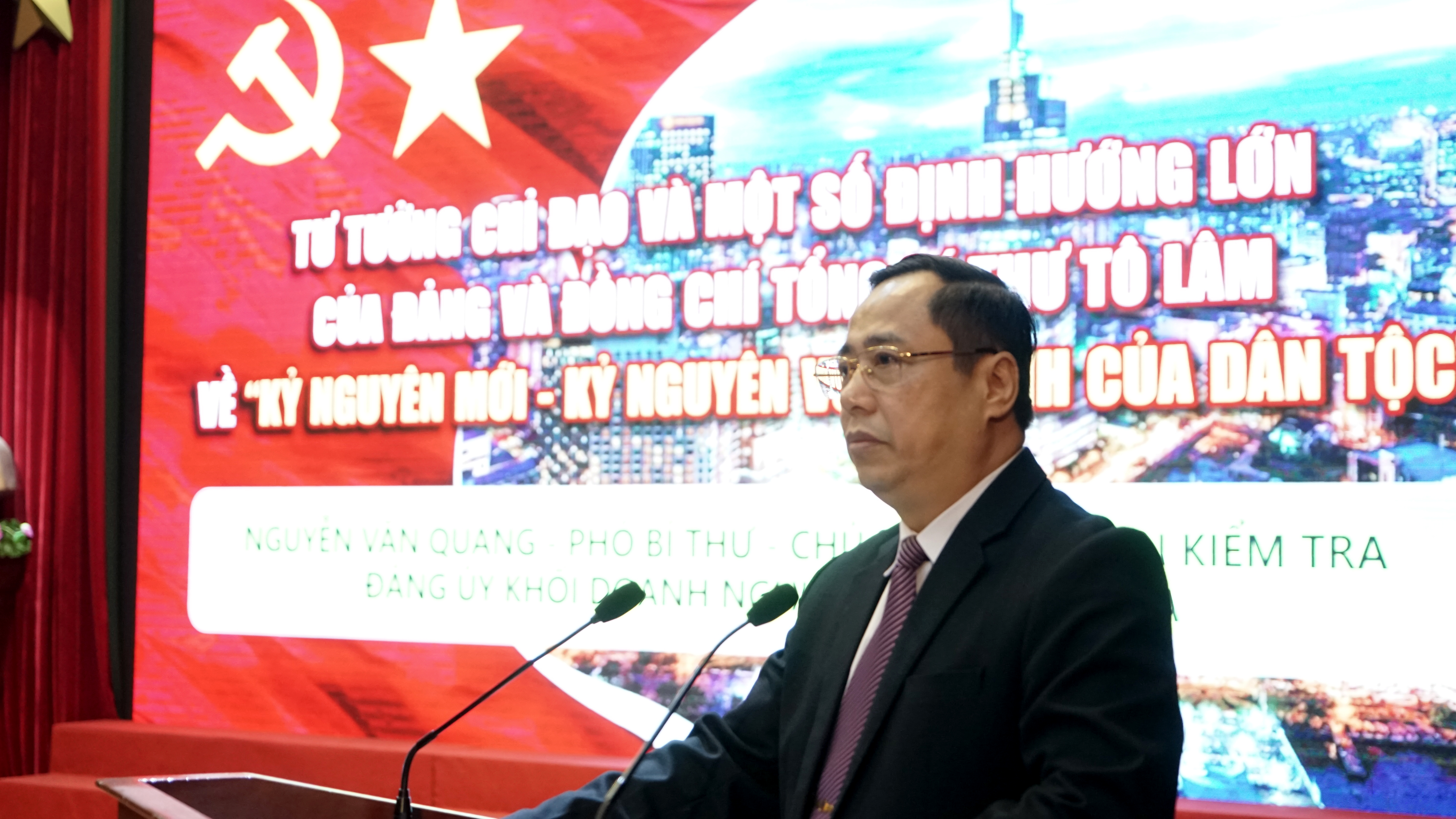 Tại hội nghị, đồng chí Nguyễn Văn Quang, Phó Bí thư, Chủ nhiệm ủy ban kiểm tra Đảng bộ Khối doanh nghiệp quận Đống Đa đã trình bày những nội dung chính về tư tưởng chỉ đạo, định hướng lớn của Đảng và đồng chí Tổng Bí thư Tô Lâm về “kỷ nguyên mới - kỷ nguyên vươn mình của dân tộc”.