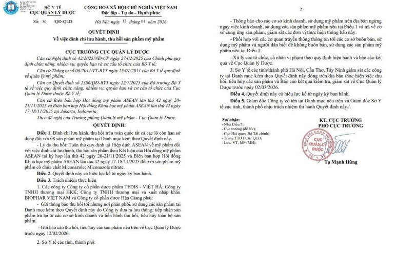 Cụ thể, Cục Quản lý Dược đã ban hành Quyết định số 30/QĐ-QLD về việc đình chỉ lưu hành và thu hồi tất cả các lô mỹ phẩm còn hạn sử dụng có chứa chất Miconazole và Miconazole nitrate.
