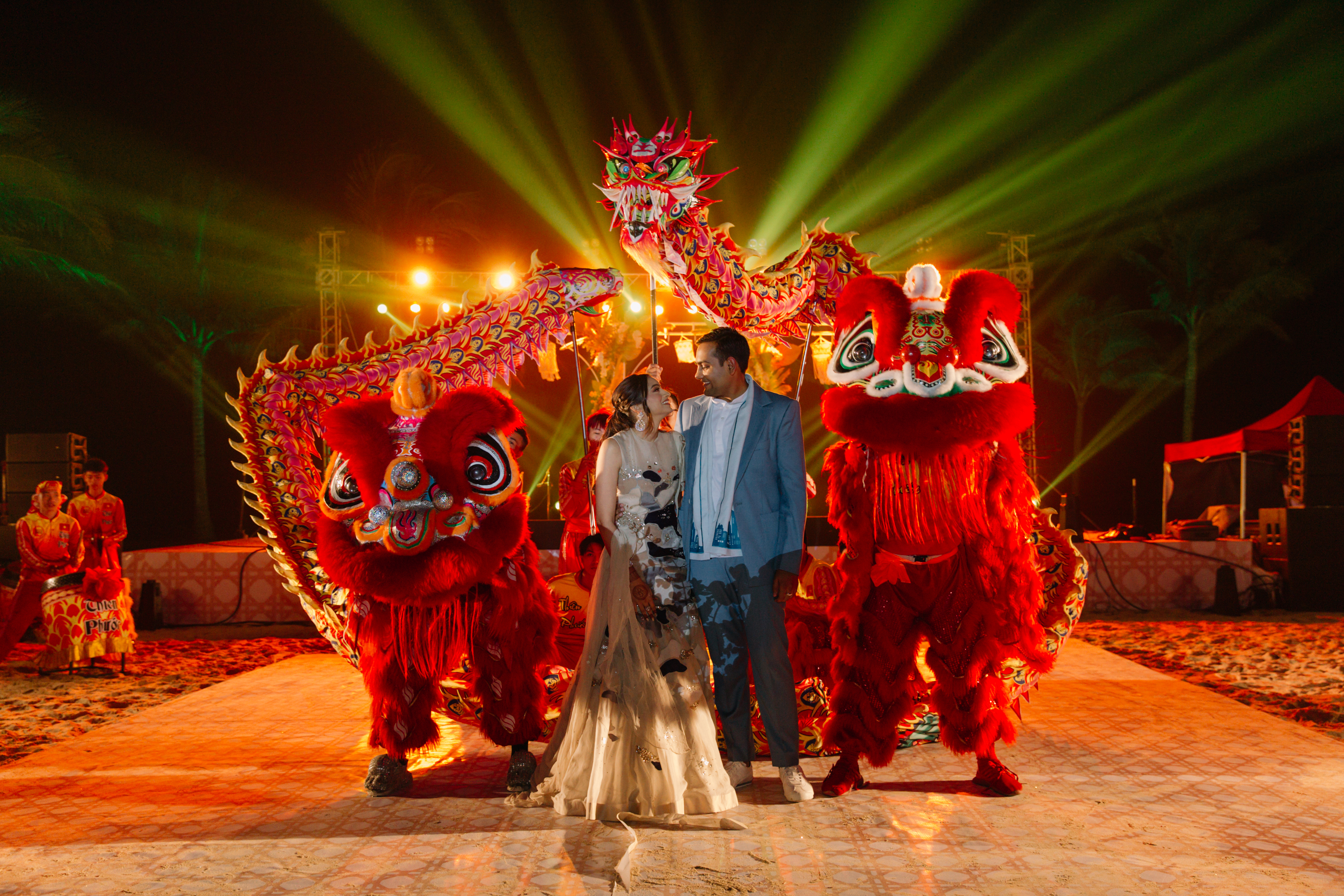 Đêm chính lễ, màn Lân Sư Rồng rộn ràng với tông màu đỏ chủ đạo, biểu tượng của may mắn, bình an và sung túc, mở màn làm nền cho sự xuất hiện ấn tượng của cặp đôi Pranay Karnawat và Sakshi Sanghvi. Quan khách như vỡ oà khi chứng kiến những khoảnh khắc hạnh phúc ngọt ngào của tân lang và tân nương được tôn vinh trên bãi biển Bình Minh hoang sơ.