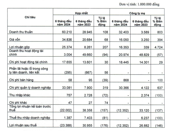 Như vậy, theo Báo cáo tài chính bán niên kiểm toán, nửa đầu năm 2024, Saigonres ghi nhận doanh thu tăng 108,1% so với cùng kỳ, tương ứng tăng thêm 31,27 tỷ đồng lên 60,21 tỷ đồng, lợi nhuận sau thuế chuyển từ lãi 38,96 tỷ đồng sang lỗ 23,39 tỷ đồng, tức giảm 54,35 tỷ đồng.