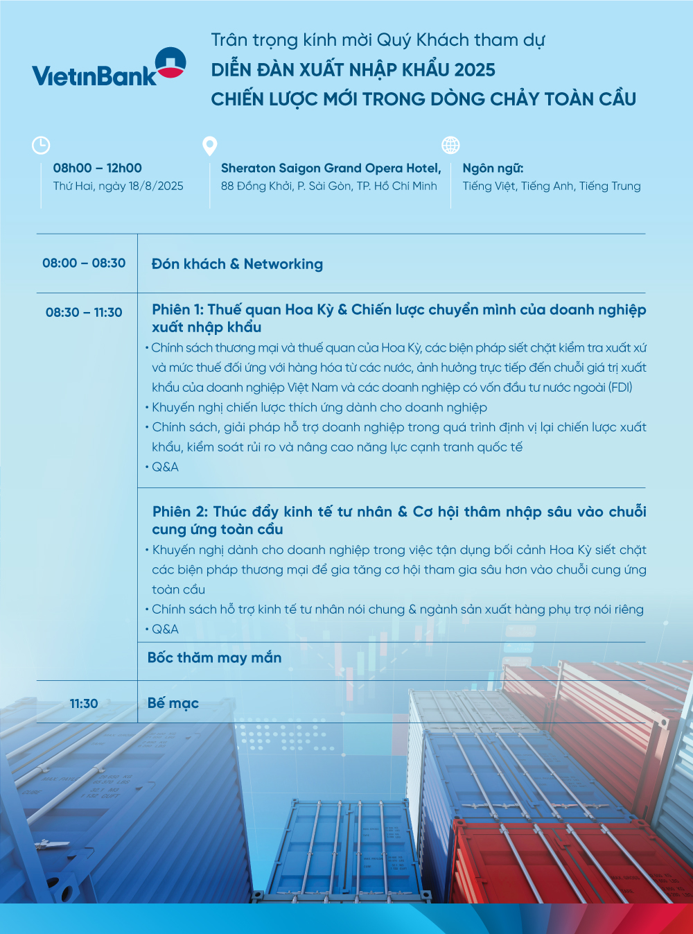 Diễn đàn Xuất nhập khẩu 2025 – Chiến lược mới trong dòng chảy toàn cầu, do VietinBank tổ chức, sẽ chính thức diễn ra vào ngày 18/8/2025 tới đây tại Sheraton Saigon Grand Opera Hotel - Hồ Chí Minh. Mọi thông tin chi tiết và đăng ký tham dự, Quý khách hàng vui lòng liên hệ các chi nhánh của VietinBank trên toàn quốc.