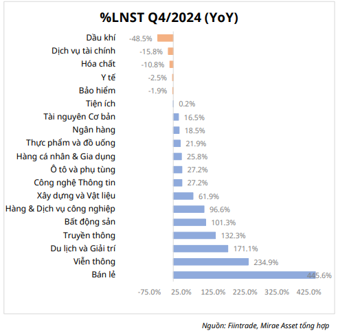 Theo Mirae Asset, bức tranh kết quả kinh doanh toàn thị trường quý 4/2024 tính đến ngày 03/02/2025, nhìn chung có sự tăng trưởng ổn định và phân hóa giữa các nhóm ngành. Số lượng nhóm ngành có lợi nhuận sau thuế (LNST) tăng trưởng dương giảm so với quý 3/2024, nhưng vẫn duy trì tốc độ tăng trưởng tổng LNST toàn thị trường ổn định.