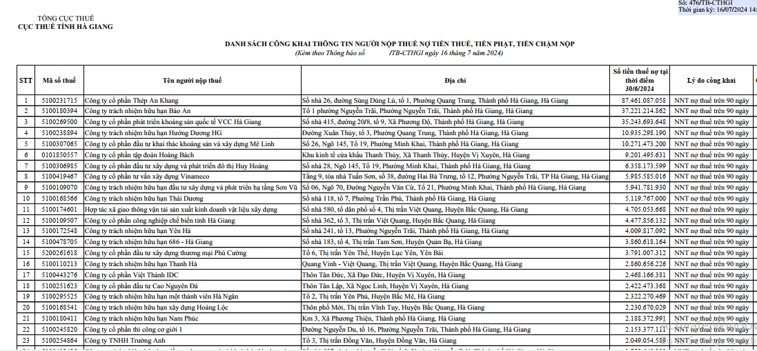 Đứng đầu danh sách là Công ty cổ phần Thép An Khang (địa chỉ: Số nhà 26, đường Sùng Dúng Lù, tổ 1, phường Quang Trung, thành phố Hà Giang, Hà Giang. MST: 5100231715). Số tiền thuế nợ hơn 87 tỷ đồng.