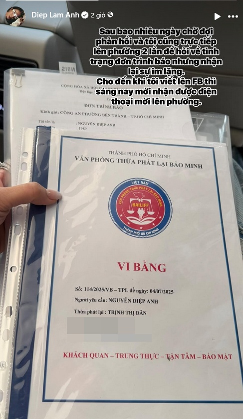 Kèm theo đó, cách đây ít giờ, Diệp Lâm Anh tiếp tục đăng hình ảnh vi bằng kèm dòng trạng thái: "Sau bao nhiêu ngày chờ đợi phản hồi và tôi cũng trực tiếp lên phường 2 lần để hỏi về tình trạng đơn trình báo nhưng nhận lại sự im lặng. Cho đến khi tôi viết lên Facebook thì sáng nay mới nhận được điện thoại mời lên phường".
