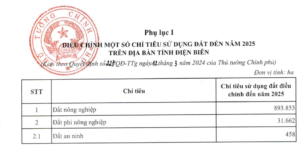 Cụ thể, đối với tỉnh Điện Biên, chỉ tiêu sử dụng đất điều chỉnh đến năm 2025 như sau: Đất nông nghiệp 893.853 ha; đất phi nông nghiệp 31.662 ha, trong đó đất an ninh 458 ha.