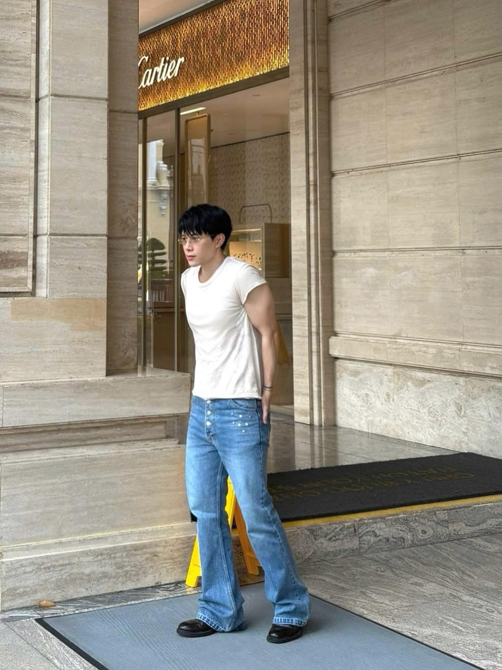 Trong hình, nam ca sĩ lên đồ đơn giản với áo phông và quần jeans nhưng vẫn vô cùng bảnh chọe, cuốn hút nhờ visual sáng trưng. Đặc biệt, chiếc áo phông cộc tay dáng body giúp Anh Tú phô diễn cơ bắp cuồn cuồn.