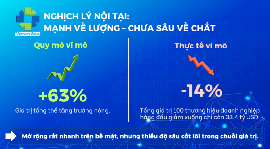 Bên cạnh những con số ấn tượng về giá trị thương hiệu quốc gia Việt Nam năm 2025 đạt 519,6 tỷ USD, tăng khoảng 63% so với năm 2020, đưa Việt Nam xếp hạng 32/193 thế giới, ông Chiến cũng chỉ ra 'nghịch lý nội tại' trong khi giá trị vĩ mô tăng trưởng "nóng", thì giá trị của Top 100 thương hiệu doanh nghiệp hàng đầu lại giảm 14% vào năm 2025, chỉ còn 38,4 tỷ USD.