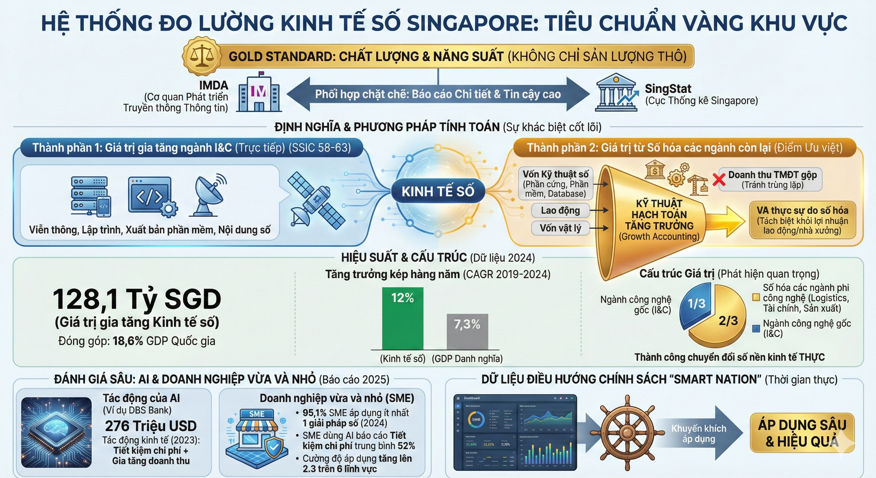 Hệ thống đo lường của Singapore không chỉ dừng lại ở vĩ mô mà còn đi sâu vào vi mô để đánh giá hiệu quả của các công nghệ mới nổi như Trí tuệ Nhân tạo (AI). Báo cáo năm 2025 của Singapore đã tích hợp các chỉ số về AI. Ví dụ, Ngân hàng DBS báo cáo tác động kinh tế trị giá 276 triệu USD từ việc áp dụng AI vào năm 2023, bao gồm tiết kiệm chi phí và gia tăng doanh thu. Các doanh nghiệp nhỏ và vừa (SME) áp dụng giải pháp AI báo cáo tiết kiệm chi phí trung bình 52%. Tỷ lệ SME áp dụng ít nhất một giải pháp số đạt 95,1% vào năm 2024, với cường độ áp dụng tăng lên 2,3 trên 6 lĩnh vực số hóa.