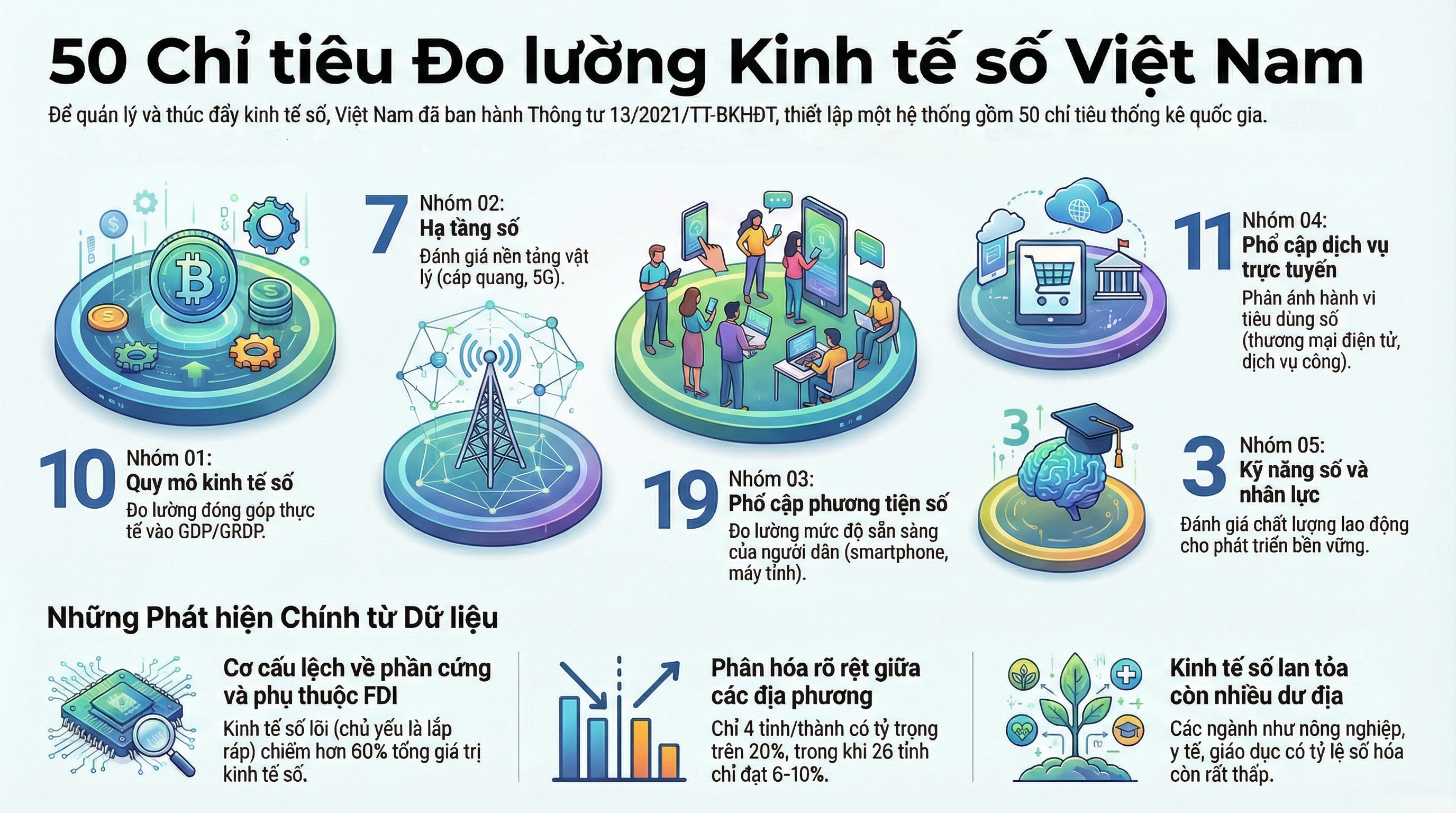 Hệ thống chỉ tiêu kinh tế số tại Việt Nam được thiết kế gồm 50 chỉ tiêu, chia thành 5 nhóm, phản ánh tư duy quản lý toàn diện từ đầu vào (hạ tầng, nhân lực) đến đầu ra (quy mô kinh tế, hiệu quả sử dụng).