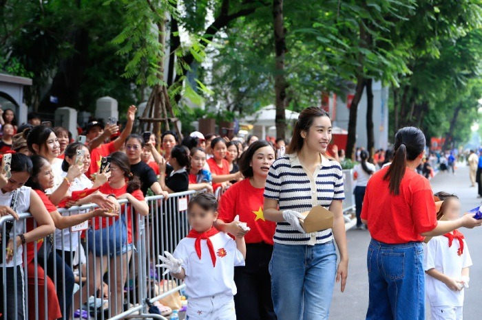 Ngày 27/8, Hoa hậu Đỗ Mỹ Linh gây bất ngờ khi xuất hiện tại khu vực đường Nguyễn Thái Học (Hà Nội) để tặng đồ ăn, bánh kẹo và nước uống cho lực lượng làm nhiệm vụ cũng như người dân theo dõi buổi sơ duyệt diễu binh, diễu hành nhân dịp 80 năm Quốc khánh 2/9.