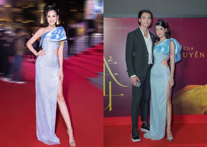 Đỗ Thị Hà rất chuộng các thiết kế xẻ cao tít tắp để phô diễn "cặp kiếm Nhật" 1m11. Đây cũng là lợi thế giúp nàng hậu ăn đứt các Mỹ Duyên khi "đụng hàng" mẫu váy màu xanh bất đối xứng.