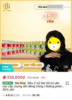 Tiếp đó, đến tháng 10/2024, sản phẩm yến sào do chị S., bán được quảng cáo thành phần có 35% yến, niêm yết với giá 390k/ 20 hũ. Tuy nhiên, nếu được áp mã giảm giá, sản phẩm chỉ còn 359k (tính ra khoảng 18k/ hũ).