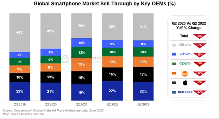 Theo một báo cáo mới nhất của Counterpoint Research, doanh số smartphone toàn cầu trong quý 2/2023 đã giảm 8% so với cùng kỳ năm ngoái. Đây là lần đầu tiên doanh số smartphone toàn cầu giảm trong hai năm liên tiếp.