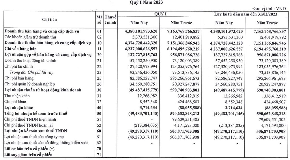 Về phía nguồn vốn, nợ phải trả thời điểm cuối quý 1 ở mức 7.462 tỷ đồng, giảm 647 tỷ đồng so với đầu năm, trong đó nợ vay hơn 5.608 tỷ đồng, hoàn toàn là nợ vay ngắn hạn bằng VND và đồng USD, chiếm 44% tổng nguồn vốn. Lợi nhuận sau thuế chưa phân phối cuối kỳ là gần 1.570 tỷ đồng.