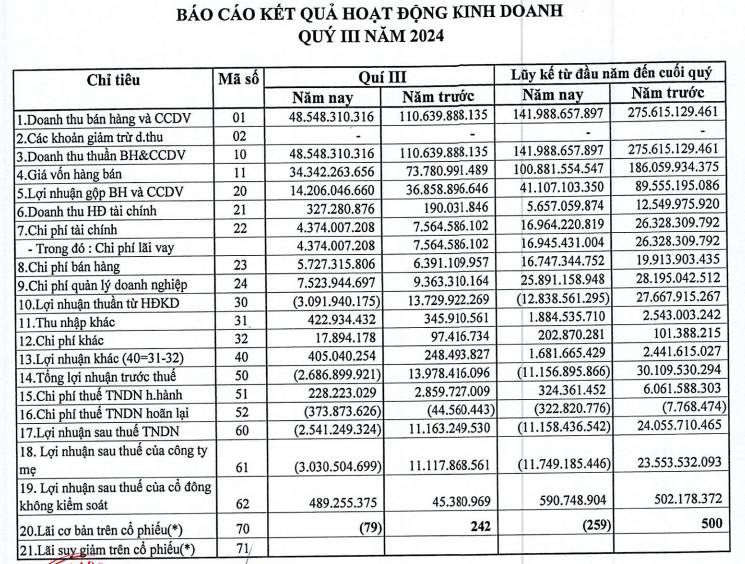 Bước sang năm 2024, doanh nghiệp liên tục báo lỗ trong cả 3 quý đầu năm. Lũy kế 9 tháng đầu năm, công ty ghi nhận doanh thu thuần đạt gần 142 tỷ đồng, trong khi năm trước đạt hơn 275,6 tỷ đồng. Lợi nhuận sau thuế ghi nhận con số âm hơn 11,7 tỷ đồng, trong khi năm trước công ty báo lãi hơn 23,5 tỷ đồng.