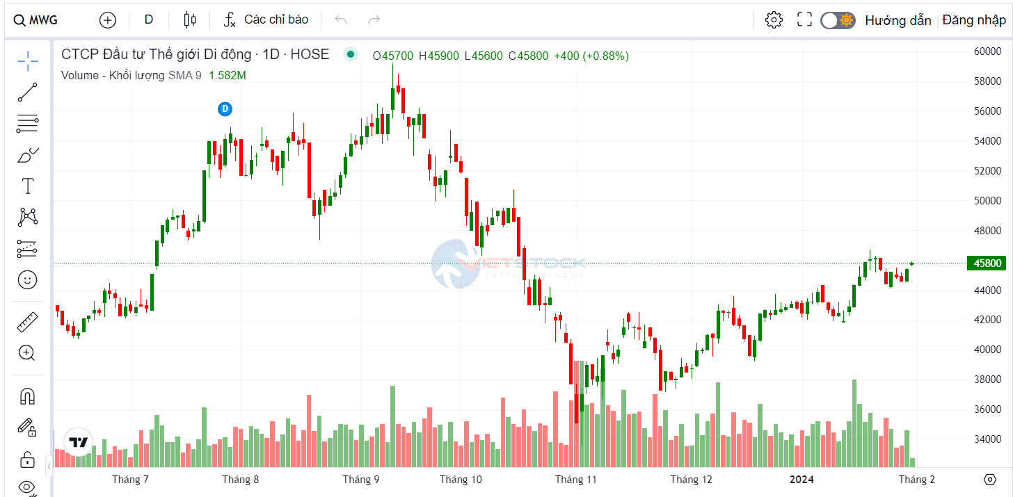 Trong bối cảnh khối ngoại liên tục xả hàng, kết quả kinh doanh ảm đạm, cổ phiếu MWG có lúc giảm xuống đáy 36.000 đồng/cp vào tháng 11/2023, giảm mạnh so với mức 58.000 đồng/cp cách đó 2 tháng.