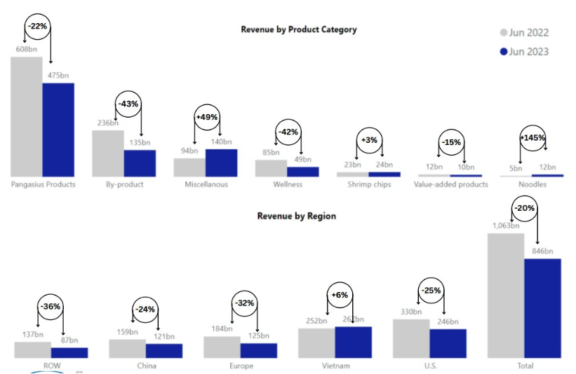 Về cơ cấu doanh thu, mảng cá tra vẫn tiếp tục suy giảm, với mức giảm 22% còn 475 tỷ đồng, đóng góp 56% vào doanh thu chung của công ty. Các sản phẩm phụ, chăm sóc sức khỏe và sản phẩm giá trị gia tăng cũng sụt giảm, lần lượt 43%, 42% và 15%. Bù lại, mảng bánh phồng tôm, bún gạo và khác tăng trưởng hai đến ba chữ số, nhưng mức đóng góp không nhiều.