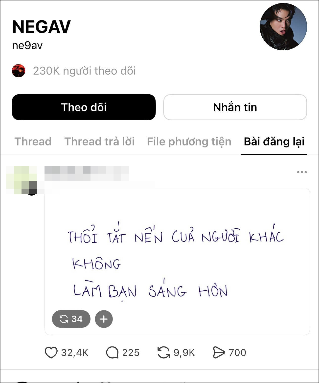 Sau vài ngày im lặng, mới đây Negav đã có động thái trên trang Threads cá nhân. Nam rapper đã chia sẻ lại một bài viết có nội dung: "Thổi tắt nến của người khác không làm bạn sáng hơn".