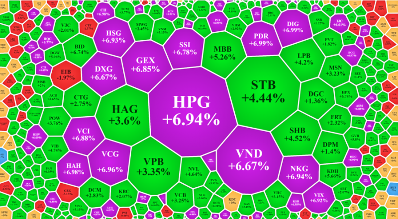 Đáng chú ý, trong phiên giao dịch hôm nay, việc tăng điểm cũng thể hiện ở độ rộng của các nhóm ngành. Nhóm chứng khoán và bất động sản cũng xuất hiện nhiều mã tăng kịch trần như PDR (+6.99%) và SSI (+6.78%), DIG (+6.99%), DXG (+6.92%), VIX (+6.92%), VCI (+6.88%), VND (+6.67%). Nhóm ngân hàng có mức tăng mạnh từ 3-5%. Cổ phiếu thép cũng có đà tăng ngoạn mục với HPG (+6.94%), NKG (+6.94%) và HSG (+6.93%). Bên cạnh đó, nhóm đầu tư công cũng bứt phá mạnh mẽ với hàng loạt mã tăng trần như VCG (+6.96%), FCN (+6.91%) hay HHV (+6.69%).