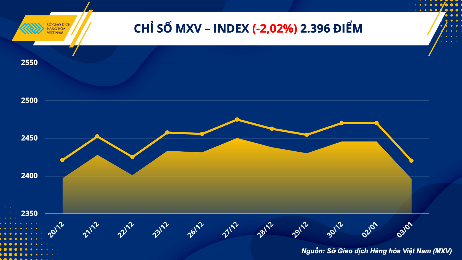 Theo thông tin từ Sở Giao dịch Hàng hoá Việt Nam (MXV) cũng cho thấy trở lại sau kỳ nghỉ lễ, thị trường hàng hoá biến động rất mạnh trong ngày hôm qua 3/1. Đặc biệt, đà lao dốc của các mặt hàng năng lượng đã kéo chỉ số MXV- Index giảm hơn 2%, xuống 2.396 điểm.