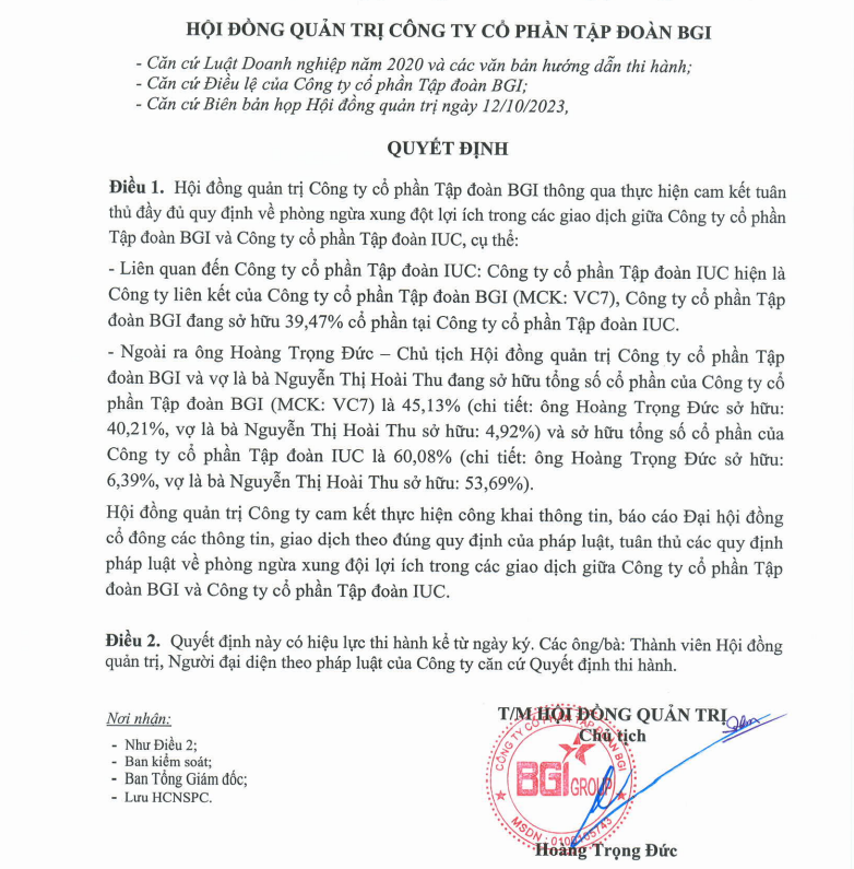 Ngày 12/10/2023, BGI group đã có văn bản gửi Uỷ ban Chứng khoán Nhà nước và HNX công bố về việc đã thông qua thực hiện cam kết tuân thủ đầy đủ quy định về phòng ngừa xung đột lợi ích trong các giao dịch giữa BGI và công ty liên kết là IUC.