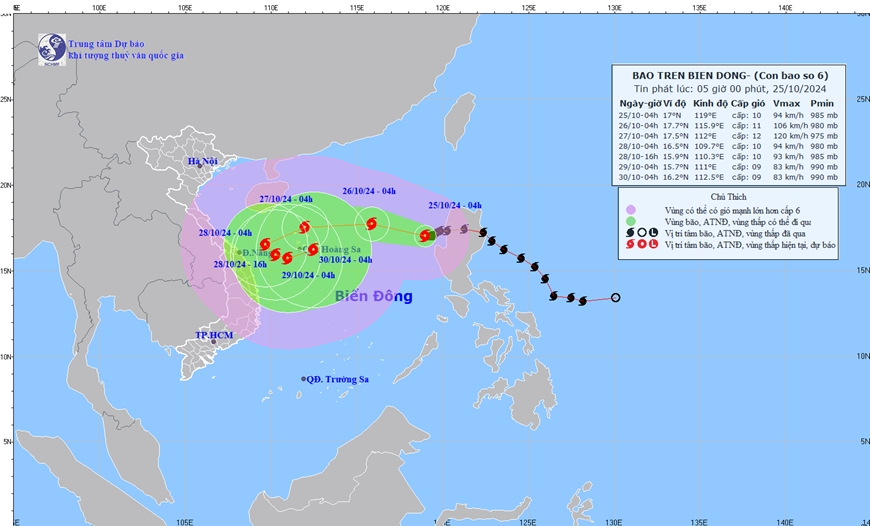 Theo Trung tâm Dự báo khí tượng thủy văn Quốc gia, hồi 4 giờ ngày 25/10, vị trí tâm bão ở vào khoảng 17,0 độ Vĩ Bắc; 119,0 độ Kinh Đông, trên vùng biển phía Đông của khu vực Bắc Biển Đông. Sức gió mạnh nhất vùng gần tâm bão mạnh cấp 9-10 (75-102km/h), giật cấp 12. Di chuyển theo hướng Tây, tốc độ khoảng 10km/h.