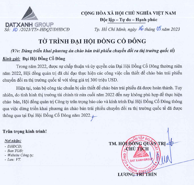 CTCP Tập đoàn Đất Xanh (mã: DXG) sẽ tổ chức ĐHĐCĐ thường niên 2023 vào ngày 19/5 tới đây theo hình thức họp trực tuyến. Theo dự thảo Tài liệu ĐHĐCĐ thường niên 2023 vừa công bố, Công ty dự kiến trình nội dung dừng triển khai phương án chào bán trái phiếu chuyển đổi ra thị trường quốc tế.