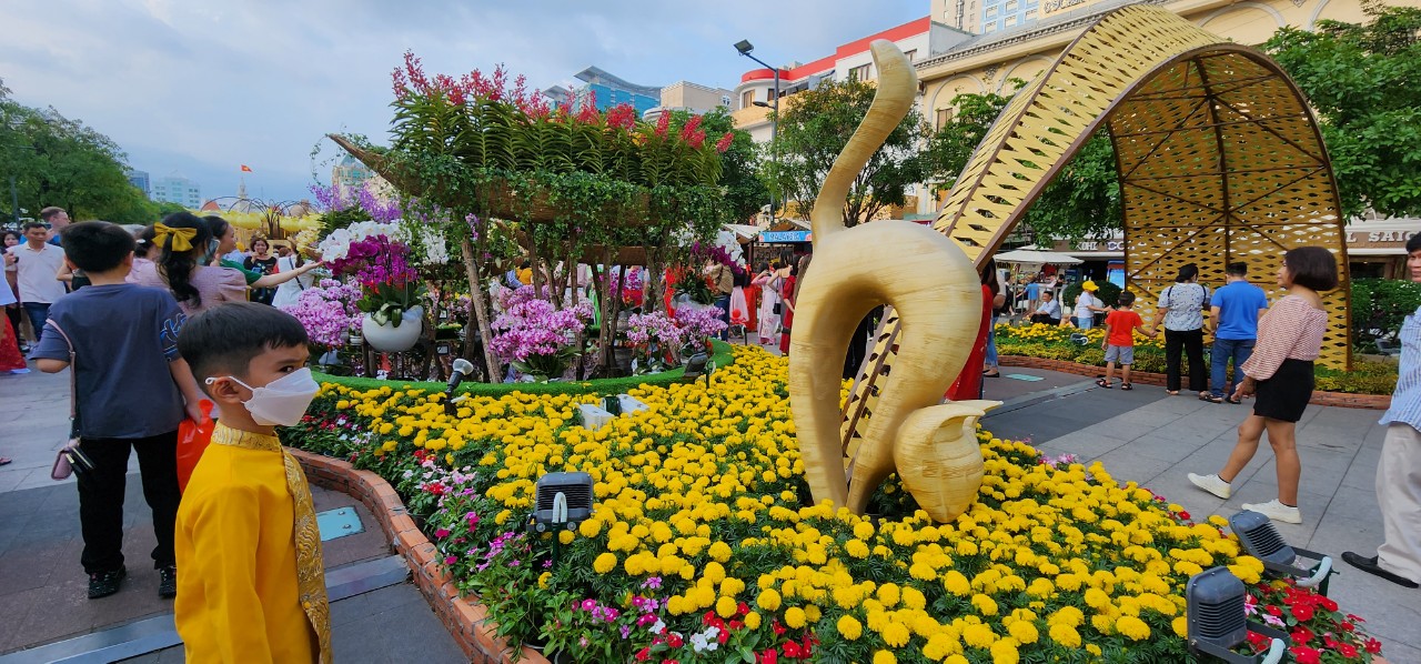 Theo ghi nhận của PV Thương Trường vào chiều Mùng 1 Tết Quý Mão 2023, tại đường hoa Nguyễn Huệ (quận 1, TP.HCM) có rất đông người tới thăm quan, du xuân.