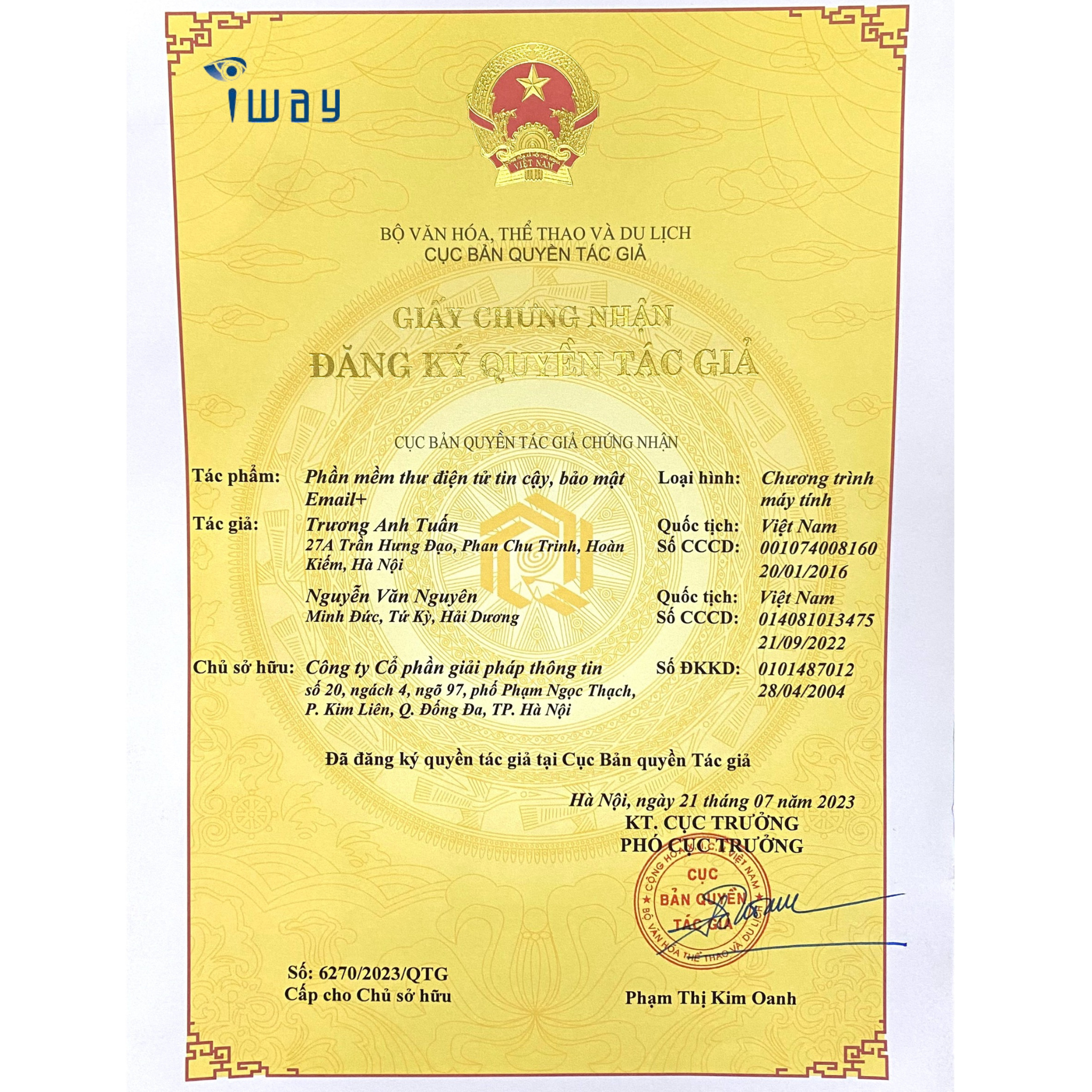 Mới đây, một công ty Việt Nam đã được cục Bản quyền tác giả cấp giấy chứng nhận đăng ký quyền tác giả cho phần mềm thư điện tử với tên gọi đầy đủ là “Phần mềm thư điện tử tin cậy, bảo mật Email+”, một sản phẩm đã nhiều năm được phát triển, tùy biến, tối ưu bảo mật cho người Việt. Phóng viên đã có cuộc trao đổi với anh Trương Anh Tuấn – Giám đốc Công ty Cổ phần Giải pháp Thông Tin (iWay) về sự kiện này.