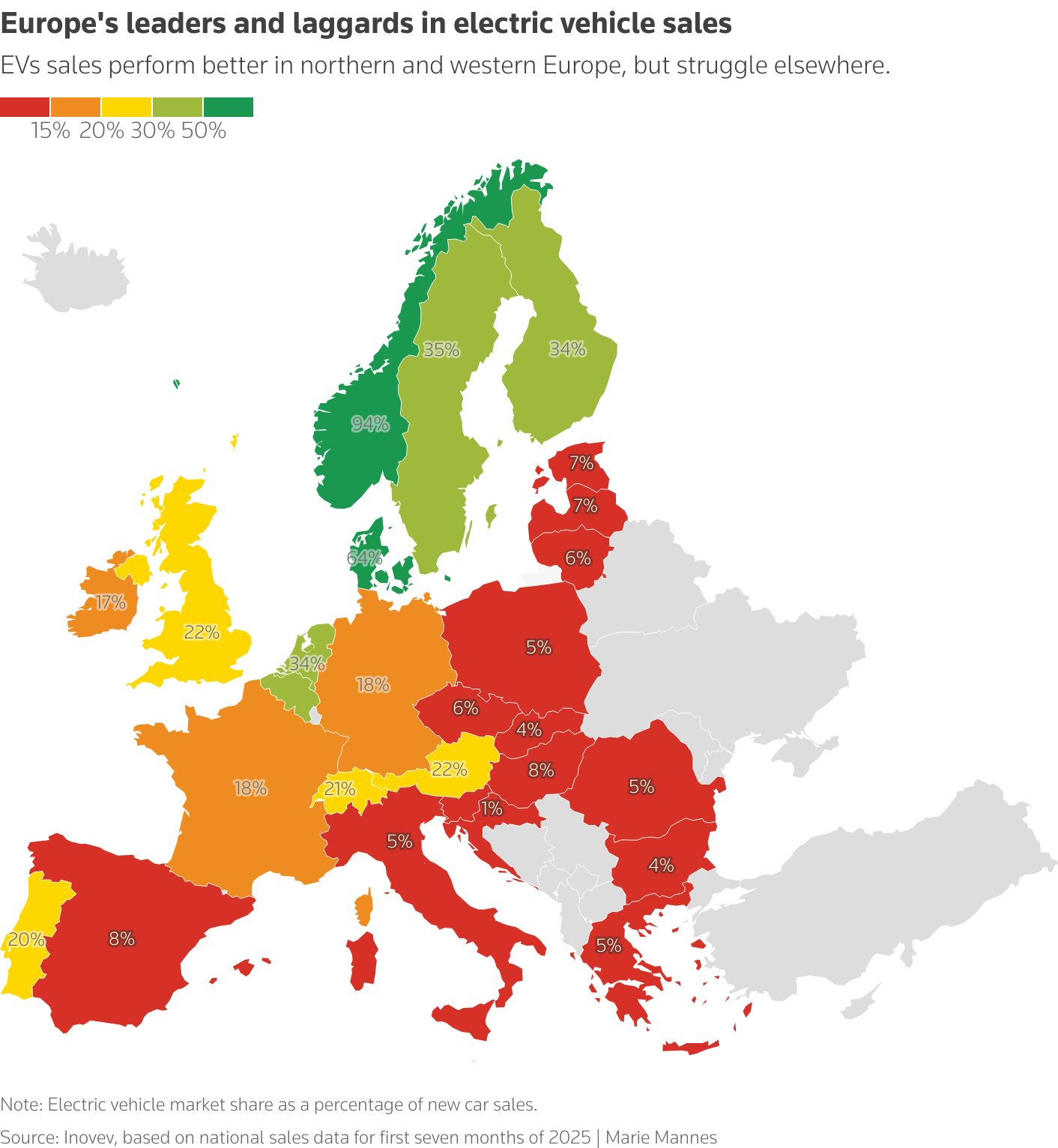 Biểu đồ thể hiện tỷ lệ phần trăm doanh số bán xe điện theo từng quốc gia ở châu Âu trong bảy tháng đầu năm 2025.