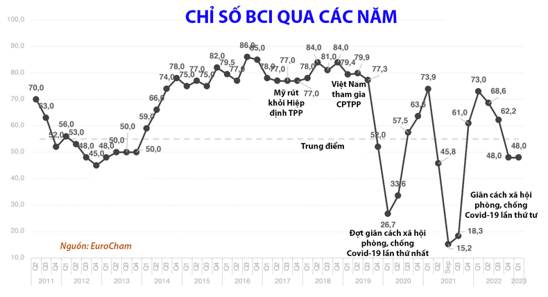 Theo đó, chỉ số Môi trường kinh doanh (BCI), một chỉ số đo lường tâm lý kinh doanh của cộng đồng nhà đầu tư và doanh nghiệp (DN) châu Âu tại Việt Nam giữ mức ổn định 48,0 điểm trong quý I/2023. Mặc dù chỉ số này giữ nguyên so với cuối năm 2022 nhưng đã có những dấu hiệu hứa hẹn một sự thay đổi tích cực trong triển vọng kinh tế của cộng đồng DN châu Âu.