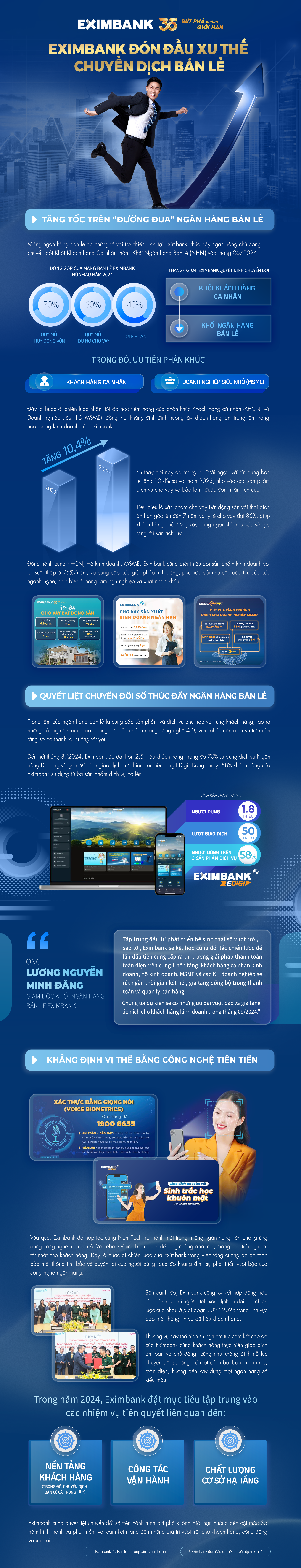 Tăng tốc trên "đường đua" ngân hàng bán lẻ, mảng ngân hàng bán lẻ đã chứng tỏ vai trò chiến lược tại Eximbank, thúc đẩy ngân hàng chủ động chuyển đổi khối Khách hàng cá nhân thành khối Ngân hàng bán lẻ (NHBL) vào tháng 6/2024.