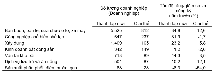 Theo khu vực kinh tế, tháng 1/2024 có 151 doanh nghiệp thành lập mới thuộc khu vực nông, lâm nghiệp và thủy sản, tăng 20,8% so với tháng 01/2023; 3.208 doanh nghiệp thuộc khu vực công nghiệp và xây dựng, tăng 26,3%; 10.200 doanh nghiệp thuộc khu vực dịch vụ, tăng 24,4%.