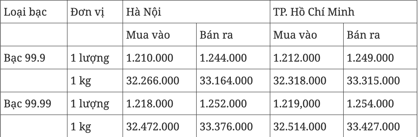 Tại TP. Hồ Chí Minh, hiện giá bạc được các doanh nghiệp niêm yết ở mức 1.212.000 đồng/lượng (mua vào) và 1.249.000 đồng/lượng (bán ra), tăng 22.000 đồng/lượng cả chiều mua và bán so với phiên giao dịch sáng 13/8.