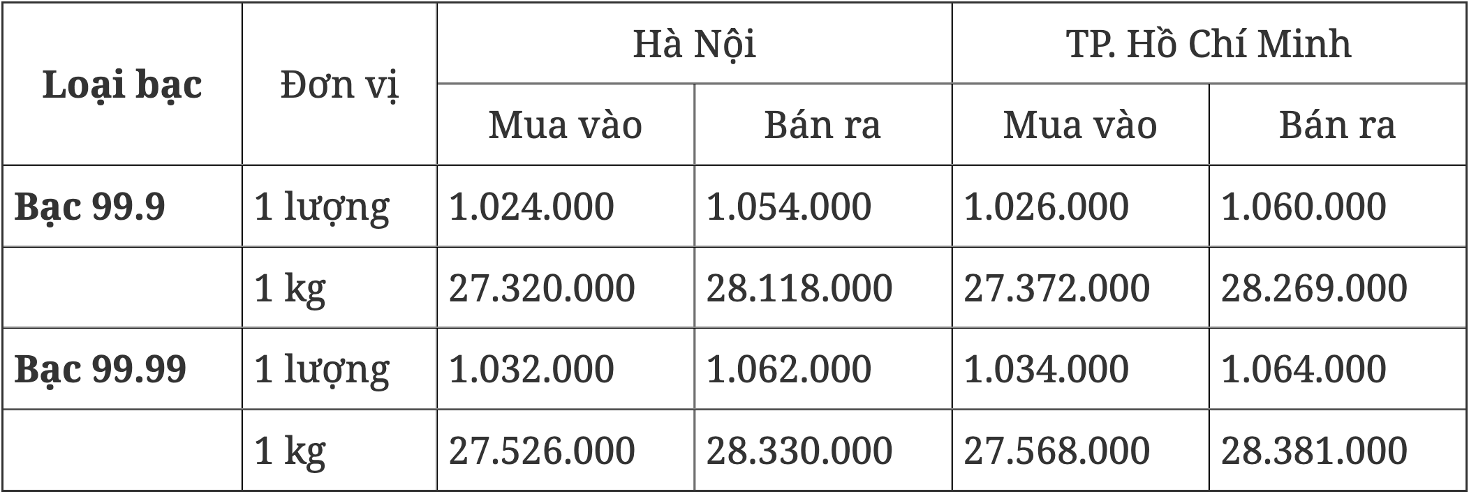 Giá bạc tại Hà Nội và TP. Hồ Chí Minh ngày 15/4/2025: