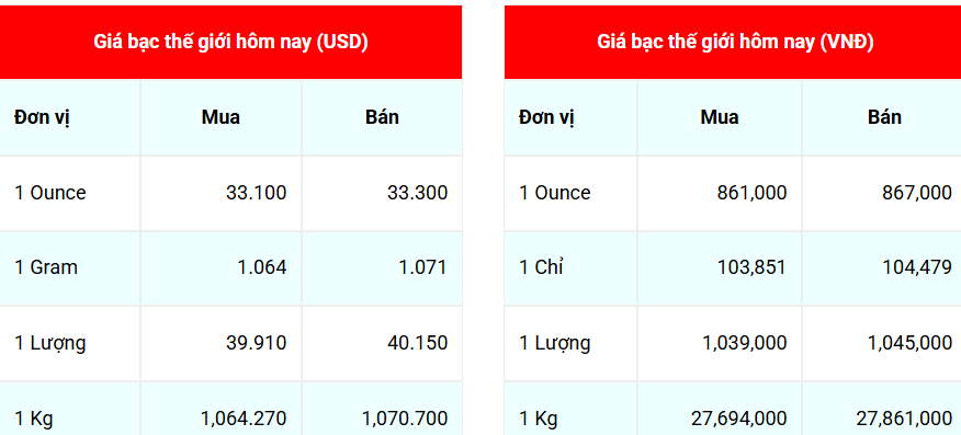 Thông tin mới nhất về giá bạc tại Hà Nội và TP. Hồ Chí Minh ngày 26/4/2025: