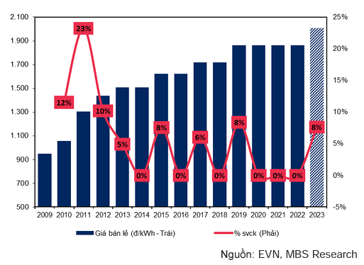 MBS lưu ý vẫn còn nhiều dư địa để EVN tiếp tục tăng giá điện khi từ đầu năm, Bộ Công Thương đã chính thức điều chỉnh tăng khung xác định giá bán lẻ điện lên 1.826-2.444đ/kWh (tương đương dư địa tăng giá còn lại là 21%). Ngoài ra, dự thảo về cơ chế tính giá điện mới nếu được thông qua sẽ là cơ sở để EVN tiếp tục tăng giá điện.