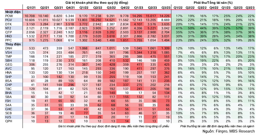 Xu hướng khoản phải thu tăng mạnh từ các doanh nghiệp điện bắt đầu từ 2022, khi nền giá đầu vào thế giới bắt đầu tăng mạnh và EVN gặp khó khăn về tài chính. Đặc biệt nhiều doanh nghiệp nhiệt điện nột bật trên sàn như POW, PGV, NT2, QTP, HND ghi nhận mức tăng mạnh nhất do giá bán điện cao, đây cũng là những doanh nghiệp ghi nhận tỉ lệ phải thu/tổng tài sản cao trong ngành, chủ yếu là phải thu từ EVN.