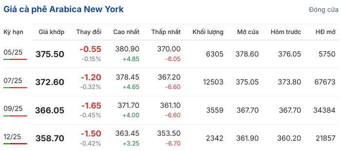 Trên Sàn giao dịch New York, giá cà phê arabica giao tháng 5/2025 giảm nhẹ 0,15% (0,55 US cent/pound) so với phiên giao dịch trước, về mốc 375,5 US cent/pound; hợp đồng giao kỳ hạn tháng 7/2025 giảm 0,32% (1,2 US cent/pound), đạt 372,6 US cent/pound.