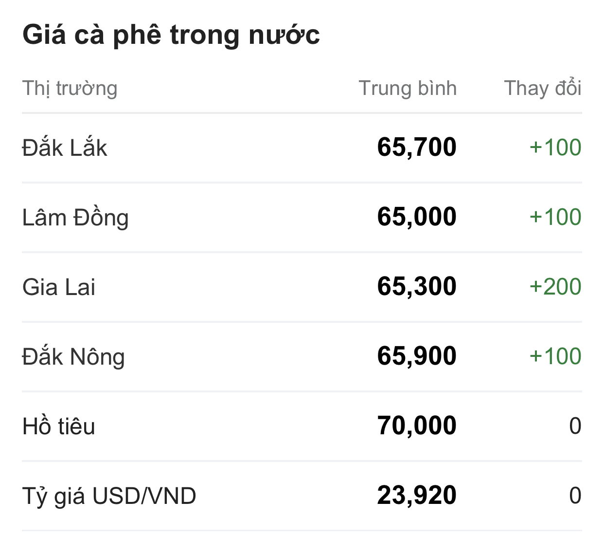 Trong đó, các địa phương đang thu mua cà phê với giá trong khoảng 65.000 - 65.900 đồng/kg.