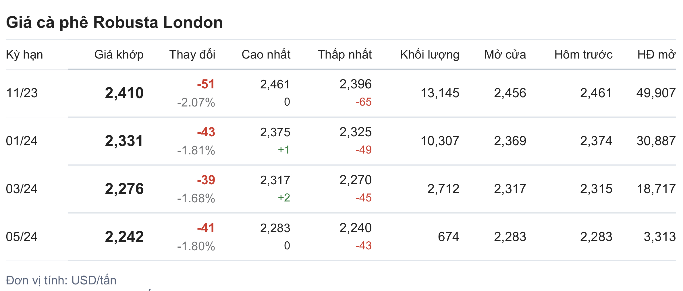 Theo ghi nhận, giá cà phê trên thị trường thế giới giảm. Theo đó, giá cà phê trực tuyến robusta tại London giao tháng 11/2023 được ghi nhận tại mức 2.410 USD/tấn sau khi giảm 2,07% (tương đương 51 USD).